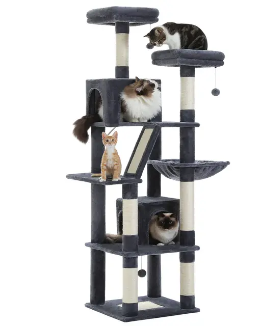 Scratching Galore: Equipped with six scratching posts wrapped in durable sisal and two scratch boards, our cat tree meets your cat's natural scratching needs. It helps keep their claws healthy while deterring them from using your furniture as a scratch pad.