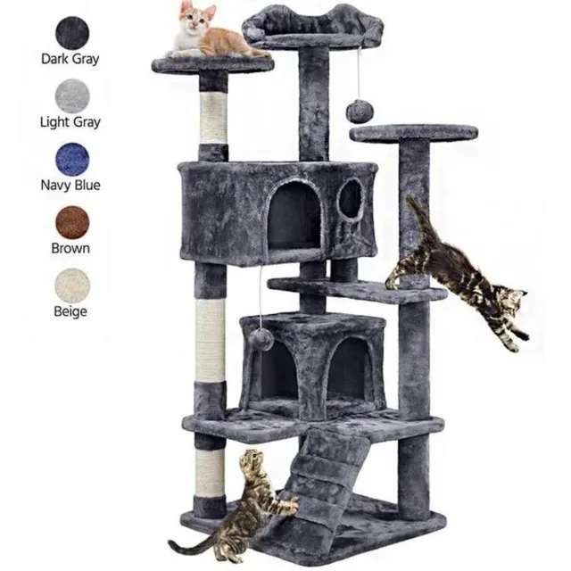This 54.5'' multi-tier cat tree keeps your cats from scratching your furniture and provides them with a space for fun. It is constructed of skin-friendly particle board with soft plush. The natural imported sisal rope covered posts, hanging fur balls, comfortable perches are definitely fit for your cats to climb, scratch, play and rest.